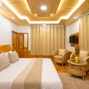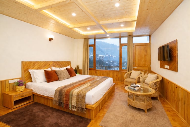 Spacious bedrooms in our private cottage in Manali designed for families and groups, featuring wooden interiors, cozy comfort, and beautiful mountain views.Perfect for guests looking for a private cottage in Manali for family stay with comfort and complete privacy.